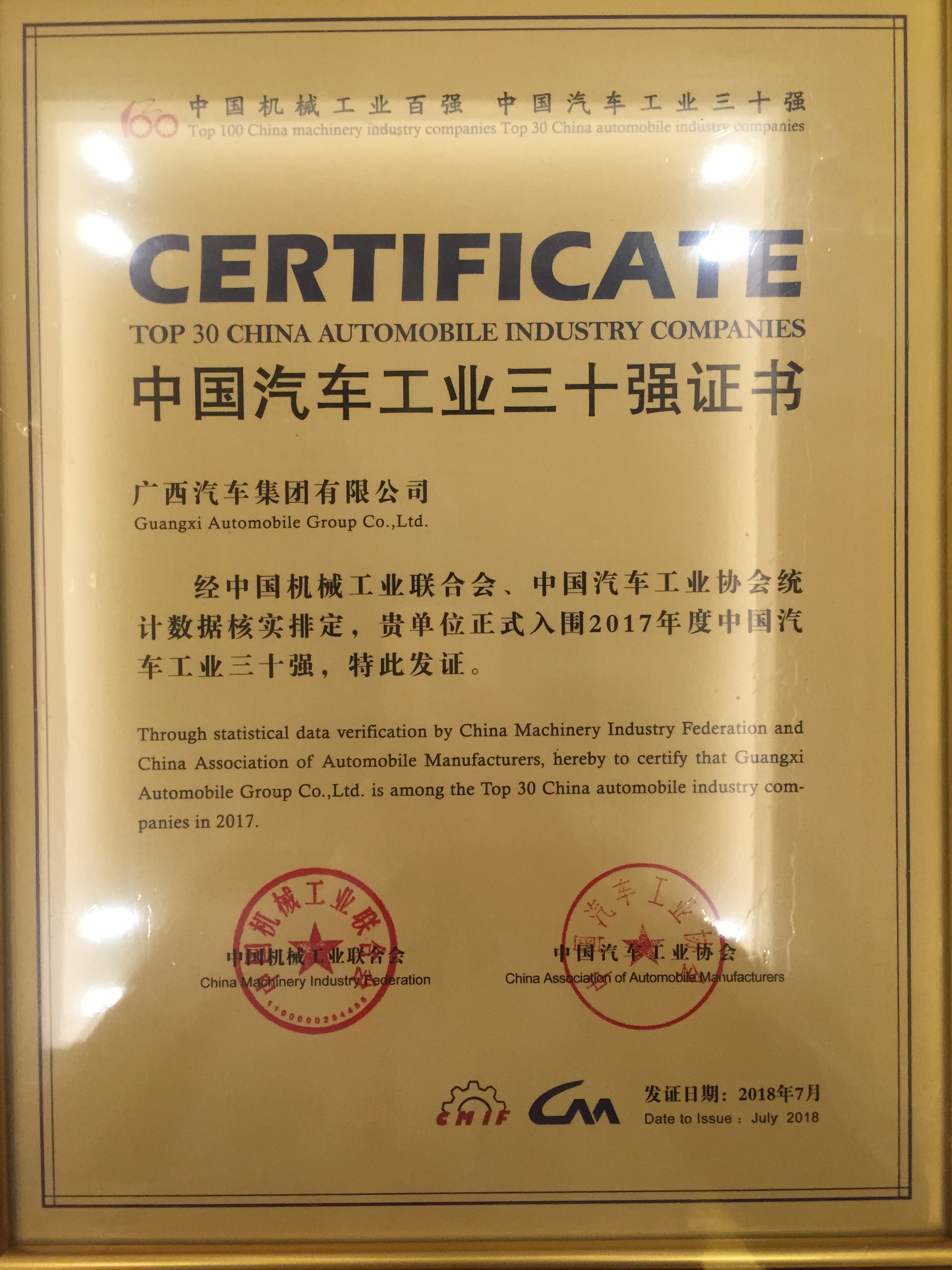 2018年7月13日,由中國(guó)機(jī)械工業(yè)聯(lián)合會(huì)、中國(guó)汽車工業(yè)協(xié)會(huì)聯(lián)合組織開(kāi)展的“2017年中國(guó)機(jī)械工業(yè)百?gòu)?qiáng)企業(yè)、汽車工業(yè)30強(qiáng)企業(yè)”榜單揭曉并正式向社會(huì)發(fā)布,廣西汽車集團(tuán)公司以2017年度營(yíng)業(yè)收入220億元榮登“2017中國(guó)汽車工業(yè)30強(qiáng)企業(yè)”榜單,排名第21位,集團(tuán)已連續(xù)10年躋身“中國(guó)汽車工業(yè)30強(qiáng)企業(yè)”行列。
