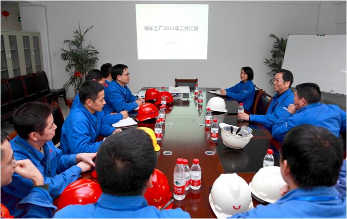 ? ??隨后,韋董一行來到公司柳東工廠進(jìn)行調(diào)研,在參觀生產(chǎn)現(xiàn)場(chǎng)后與柳東管理團(tuán)隊(duì)進(jìn)行座談。柳東工廠廠長黃輯匯報(bào)了2015年柳東工廠運(yùn)行情況及2016年業(yè)務(wù)突破。